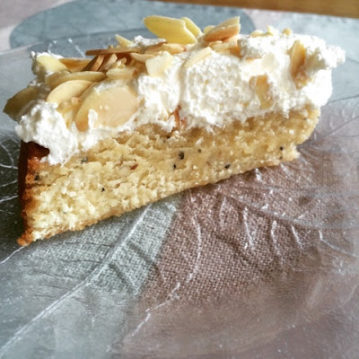 9. Bred ut grädden över den avsvalnade kakan. Strö över mandelflagorna och pudra över lite florsocker.